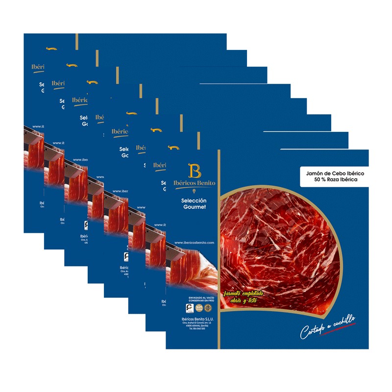 Jamón de Cebo Ibérico 50% R.I. Benito cortado a cuchillo en sobres de 100gr.